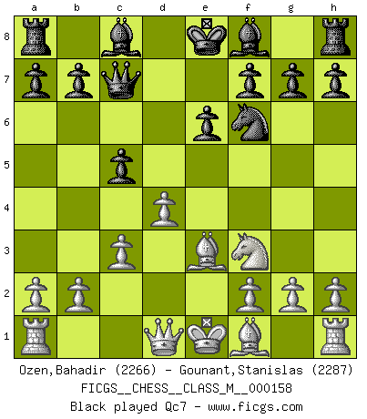 Last move : 1/2-1/2 2025 October 9 13:45:52 [Event "FICGS__CHESS__CLASS_M__000158"] [Site "FICGS"] [Date "2025.09.22"] [Round "1"] [White "Ozen,Bahadir"] [Black "Gounant,Stanislas"] [Result "1/2-1/2"] [WhiteElo "2266"] [BlackElo "2287"] 1.e4 e6 2.d4 d5 3.Nd2 dxe4 4.Nxe4 Nd7 5.Nf3 Ngf6 6.Nxf6+ Nxf6 7.c3 c5 8.Be3 Qc7 9.Bb5+ Bd7 10.Bxd7+ Nxd7 11.d5 exd5 12.Qxd5 Nf6 13.Qc4 Be7 14.Bf4 Bd6 15.Bg5 Be7 16.Qb5+ Qd7 17.Qxd7+ Nxd7 18.Bxe7 Kxe7 19.O-O-O Rhd8 20.Rhe1+ Kf8 21.Kc2 Nf6 22.Ne5 Rxd1 1/2-1/2 Follow this game move after move (download)Chess makes man wiser and clear-sighted. (Vladimir Putin) Ich glaube, ich kenne inzwischen die Gründe für mein Versagen: schachliche Charakterfehler. Ich war nie ein Wunderkind und in meiner gesamten menschlichen Entwicklung immer zu langsam. (Viktor Kortschnoi) Fischer es el jugador mas fuerte del mundo. De hecho, el jugador mas fuerte que jamas haya existido. (Larry Evans) Karpov est une pièce de musée. (Garry Kasparov) Go and wake up your luck. (Persian saying)