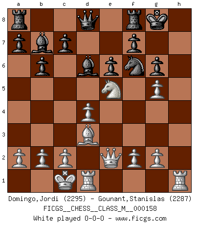 Last move : 1/2-1/2 2025 October 2 11:33:6 [Event "FICGS__CHESS__CLASS_M__000158"] [Site "FICGS"] [Date "2025.09.22"] [Round "1"] [White "Domingo,Jordi"] [Black "Gounant,Stanislas"] [Result "1/2-1/2"] [WhiteElo "2295"] [BlackElo "2287"] 1.e4 e6 2.d4 d5 3.Nc3 dxe4 4.Nxe4 Nd7 5.Nf3 Ngf6 6.Nxf6+ Nxf6 7.Be3 Bd6 8.Bd3 b6 9.Ne5 O-O 10.Bg5 Bb7 11.Qe2 h6 12.h4 hxg5 13.hxg5 g6 14.O-O-O Ne4 15.Bxe4 Qxg5+ 16.Rd2 Bxe4 17.Qxe4 Bxe5 18.dxe5 Rad8 19.f4 Qg3 20.Rh3 Qg4 21.Qf3 Qxf3 22.Rxf3 Rxd2 1/2-1/2 Follow this game move after move (download)A player surprised is half beaten. (Proverb) Jeder Schachmeister war einmal ein Anfänger. (Irving Chernev) El poder defensivo de una pieza clavada, solamente es imaginario. (Aaron Nimzovich) La menace est plus forte que l'exécution. (Aaron Nimzovitch) When you stop learning you start dying. (M. Scott Adams)