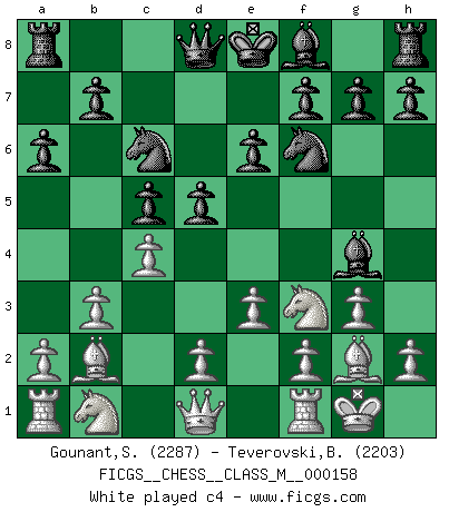 Last move : 1-0 2025 December 22 22:4:56 [Event "FICGS__CHESS__CLASS_M__000158"] [Site "FICGS"] [Date "2025.09.22"] [Round "1"] [White "Gounant,Stanislas"] [Black "Teverovski,Bogoljub"] [Result "1-0"] [WhiteElo "2287"] [BlackElo "2203"] 1.b3 d5 2.Bb2 c5 3.e3 a6 4.Nf3 Nc6 5.g3 Bg4 6.Bg2 Nf6 7.O-O e6 8.c4 d4 9.exd4 cxd4 10.d3 Bc5 11.h3 Bh5 12.a3 a5 13.g4 Bg6 14.Nh4 Nd7 15.Nxg6 hxg6 16.Nd2 Qc7 17.Qe2 O-O 18.Ne4 Be7 19.Bc1 Rae8 20.Re1 Nc5 21.Nxc5 Bxc5 22.g5 Bd6 23.Ra2 Qb6 24.Qd1 Ne7 25.Bd2 Ra8 26.Be4 Nf5 27.Kg2 Nh4+ 28.Kf1 Nf5 29.h4 Bc7 30.Ke2 Rfe8 31.Ra1 Bh2 32.Kf1 Bc7 33.Qe2 Qd6 34.Qf3 Qh2 35.Bxb7 Rab8 36.Bc6 Rf8 37.b4 Ng3+ 38.fxg3 Qxd2 39.b5 Qh2 40.Re2 Qh3+ 41.Kg1 Qxg3+ 42.Qxg3 Bxg3 43.c5 Bxh4 44.Re5 Bg3 45.Re4 Bc7 46.Rb1 Rfc8 47.Rxd4 Bd8 48.Rd7 Rxc6 49.Rxd8+ Rxd8 50.bxc6 Rc8 51.d4 f6 52.Kf2 fxg5 53.Kf3 Kf7 54.Rb6 Kf6 55.Ke4 g4 56.d5 exd5+ 57.Kxd5 Rd8+ 58.Kc4 Rc8 59.Kb5 Ke6 60.Rb7 g3 61.Rxg7 Kf6 62.Rd7 g2 63.Rd1 Ke7 64.Kb6 Rb8+ 65.Kc7 Rb3 66.Rg1 Rg3 67.Kc8 Rxa3 68.Rxg2 Rc3 69.Rxg6 Rxc5 70.c7 a4 71.Rg4 a3 72.Kb7 a2 73.Rg1 Rb5+ 74.Kc6 Rb1 75.c8Q Rxg1 76.Qd7+ Kf8 77.Qd6+ Ke8 78.Qb8+ 1-0 Follow this game move after move (download)Mistrust is the most necessary characteristic of the Chess player. (Siegbert Tarrasch) Es ist schade, dass viele Schachsportler vergessen, wie wichtig Auftreten und angemessene Kleidung sind. (Alexandra Kosteniuk) Al jugar al Ajedrez entonces, podemos aprender: Primero: Previsión... Segundo: Prudencia... Tercero: Cautela... Y al final, aprendemos del Ajedrez el hábito de no ser desanimados por apariencias malas presentes en el estado de nuestros asuntos, el hábito de la esperanza por una oportunidad favorable y la perseveración de los secretos de los recursos. (Benjamin Franklin) Le joueur d'Echecs qui veut atteindre le top est obligé de développer son propre credo créatif. Alexeï Stepanovicth Souétine. Il est facile d'écrire des livres ! Ce qui est difficile, c'est de jouer ! (Alexeï Stepanovicth Souétine) I live to kill Traxler counterattack. (Ilmars Cirulis)