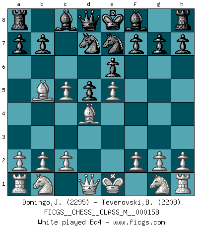 Last move : 1-0 2025 November 19 9:15:50 [Event "FICGS__CHESS__CLASS_M__000158"] [Site "FICGS"] [Date "2025.09.22"] [Round "1"] [White "Domingo,Jordi"] [Black "Teverovski,Bogoljub"] [Result "1-0"] [WhiteElo "2295"] [BlackElo "2203"] 1.e4 c6 2.d4 d5 3.e5 c5 4.dxc5 e6 5.Be3 Nd7 6.Bb5 Ne7 7.Bd4 Nc6 8.Bxc6 bxc6 9.b4 a5 10.a3 Ba6 11.f4 g5 12.Nf3 gxf4 13.Qd2 Rg8 14.Rg1 Rg6 15.Nc3 Bg7 16.Ne2 Bxe2 17.Qxe2 Kf8 18.Rf1 Qb8 19.Kf2 f6 20.exf6 Bxf6 21.Bxf6 Rxf6 22.Qd2 e5 23.Kg1 e4 24.Ng5 Ke7 25.Rae1 Qe5 26.Nf3 Qh5 27.c4 Kf7 28.cxd5 exf3 29.dxc6 Ne5 30.Qd5+ Re6 31.Kh1 fxg2+ 32.Qxg2 f3 33.b5 Rg8 34.Qa2 Ke7 35.c7 Qh3 36.Rf2 Nc4 37.Rd1 Qg4 38.Qb1 Qh4 39.Qd3 Qxf2 40.Qd8+ Kf7 41.Rd7+ Kg6 42.Qxg8+ Kf5 43.Rd5+ Ne5 44.c8Q Qe1+ 45.Qg1 f2 46.Qf8+ Rf6 47.Rxe5+ Kxe5 48.Qe7+ Kf5 49.Qg1xe1 fxe1Q+ 50.Qxe1 a4 51.b6 1-0 Follow this game move after move (download)You have to have the fighting spirit. You have to force moves and take chances. (Bobby Fischer) Rubinstein ist ein Turmendspiel, welches die Götter vor tausenden von Jahren begannen. (Savielly Grigorievitsch Tartakower) El Ajedrez es el juego mas altamente simbólico, pero las agresiones estan por lo tanto aún mas francamente representadas en la partida. Tal vez comenzo como un juego de guerra; Algo como la representación de una batalla en miniatura entre las fuerzas de dos reinos. (Karl Meninger) Le temps de noter son nom sur la feuille de partie, j'étais déjà en zeitnot ! D'un modeste amateur apparié lors de la première ronde d'un open contre le grand-maître Azmaïparashvili. Without deviation from the norm, progress is not possible. (Frank Zappa)