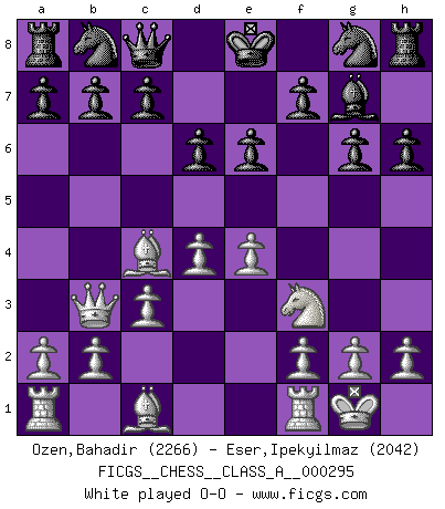 Last move : f4 2026 January 1 13:46:8 Ipekyilmaz Eser ... is in vacation until 2026 February 17 10:28:6 White clock - 95 days 08:36:52 Black clock - 77 days 00:47:02 (52 days 23:27:57) [Event "FICGS__CHESS__CLASS_A__000295"] [Site "FICGS"] [Date "2025.10.01"] [Round "1"] [White "Ozen,Bahadir"] [Black "Eser,Ipekyilmaz"] [Result "*"] [WhiteElo "2266"] [BlackElo "2042"] 1.d4 d6 2.e4 g6 3.Nf3 Bg4 4.Bc4 e6 5.Nbd2 Bg7 6.c3 h6 7.Qb3 Bxf3 8.Nxf3 Qc8 9.O-O Nd7 10.h3 Ne7 11.Re1 Kf8 12.h4 Kg8 13.Bf4 Nf6 14.Bd3 Kh7 15.e5 dxe5 16.dxe5 Nfd5 17.Bd2 Rd8 18.h5 Kg8 19.c4 Nb6 20.hxg6 fxg6 21.Be4 c6 22.Rad1 Qc7 23.c5 Nbd5 24.Nd4 Qd7 25.Qh3 Nf5 26.Bxf5 exf5 27.Bxh6 Bf8 28.Bxf8 Rxf8 29.Qg3 Qh7 30.Ne6 Rfe8 31.Nf4 Nxf4 32.Qxf4 Re6 33.Rd6 Rae8 34.Rxe6 Rxe6 35.Rd1 Qf7 36.Rd8+ Re8 37.Rd6 Re6 38.Qh6 Qe8 39.f4 * Follow this game move after move (download)All my games are real. (Bobby Fischer) Die Leute spielen gegen mich seit 15 Jahren unter Ihren Möglichkeiten. (Robert James Fischer) Yo no le temo a Spassky. Todos saben que yo soy el mejor. Uno no necesita un torneo para probarlo. (Bobby Fischer) Les échecs, c'est l'art d'analyser. (Mikhail Botvinnik) There are lots of people who mistake their imagination for their memory. (Josh Bilings)