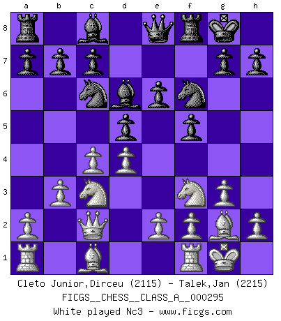 Last move : 1/2-1/2 2025 November 6 0:0:7 [Event "FICGS__CHESS__CLASS_A__000295"] [Site "FICGS"] [Date "2025.10.01"] [Round "1"] [White "Cleto Junior,Dirceu"] [Black "Talek,Jan"] [Result "1/2-1/2"] [WhiteElo "2115"] [BlackElo "2215"] 1.d4 f5 2.g3 e6 3.c4 Nf6 4.Bg2 d5 5.Qc2 Nc6 6.Nf3 Bd6 7.b3 O-O 8.O-O Qe8 9.Nc3 b6 10.a3 h6 11.cxd5 exd5 12.b4 Be6 13.e3 Ne4 14.Bb2 Ne7 15.Ne5 a5 16.Rfc1 Bd7 17.Bf1 axb4 18.axb4 Rxa1 19.Rxa1 Nxc3 20.Bxc3 Bb5 21.Bg2 Qc8 22.Qa2 Qe6 23.Qb3 1/2-1/2 Follow this game move after move (download)Chess is 99 percent tactics. (Teichmann) Ich verlor meine Bürgerrechte, mein Gehalt wurde mir nicht mehr bezahlt und ich wurde zensiert und durfte nicht mehr ins Ausland reisen. [nach dem Match Fischer-Taimanov 6:0] (Mark Taimanov) Yo considero que Fischer es uno de los expertos mas grandes de aperturas de siempre. (Keith Hayward) La vie est comme un jeu d'échecs : nous esquissons un plan, mais celui-ci est tributaire de ce que daignent faire l'adversaire aux échecs et le destin dans la vie. (Arthur Schopenhauer) The best weapon against an enemy is another enemy. (Friedrich Nietzsche)