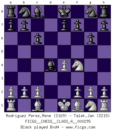 Last move : 0-1 2025 December 22 16:32:59 [Event "FICGS__CHESS__CLASS_A__000295"] [Site "FICGS"] [Date "2025.10.01"] [Round "1"] [White "Rodriguez Perez,Rene"] [Black "Talek,Jan"] [Result "0-1"] [WhiteElo "2169"] [BlackElo "2215"] 1.e4 g6 2.d4 Bg7 3.Nc3 d5 4.Nxd5 c6 5.Nf4 Qxd4 6.Qxd4 Bxd4 7.Bc4 Nf6 8.Nge2 Bb6 9.f3 Nbd7 10.Nd3 Nf8 11.a4 a5 12.b3 Be6 13.Nb2 N6d7 14.Bd2 h5 15.Nf4 Bxc4 16.Nxc4 Bc7 17.h4 e5 18.Nd3 Ne6 19.Be3 f5 20.O-O-O b5 21.Nd2 Bd6 22.Rhe1 O-O-O 23.Kb2 Kc7 24.axb5 cxb5 25.Nb1 fxe4 26.fxe4 Kc6 27.Nc3 Nec5 28.Nd5 Nxe4 29.Bb6 Nxb6 0-1 Follow this game move after move (download)Live, lose, and learn, by observing your opponent how to win. (Amber Steenbock) Die Jungen erwarten, dass Opa einfach umfällt. Dann aber kann Opa fünf Stunden lang Schach spielen und die jungen Gegner an die Wand drücken. (Viktor Kortschnoi) Morphy probablemente fue el genio más grande de todos. (Bobby Fischer) A ce moment-là, je menaçais de comprendre la position ! (Clément L'Heureux) Happy endings are just stories that haven't finished yet. (Jane Smith in Mr & Mrs Smith)