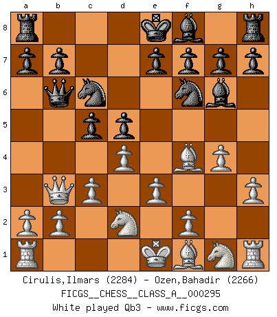 Last move : 1/2-1/2 2025 November 3 19:3:22 [Event "FICGS__CHESS__CLASS_A__000295"] [Site "FICGS"] [Date "2025.10.01"] [Round "1"] [White "Cirulis,Ilmars"] [Black "Ozen,Bahadir"] [Result "1/2-1/2"] [WhiteElo "2284"] [BlackElo "2266"] 1.d4 d5 2.c3 Nf6 3.Bf4 c5 4.e3 Nc6 5.Nd2 Bf5 6.h3 Qb6 7.g4 Bg6 8.Qb3 c4 9.Qxb6 axb6 10.Bg2 e6 11.Bg5 b5 12.Bxf6 gxf6 13.Ne2 f5 14.a3 b4 15.gxf5 Bxf5 16.e4 bxc3 17.bxc3 Bxe4 18.Nxe4 dxe4 19.Bxe4 Rxa3 20.Bxc6+ bxc6 21.Rxa3 Bxa3 1/2-1/2 Follow this game move after move (download)A big shock; the best chess player in history has passed away. (Lajos Portisch, about Bobby Fischer's death) Meine Liebe ist Schach, Schach, Schach. Ich muss jeden Tag Schach spielen, deshalb fühle ich mich so stark. (Miguel Najdorf) Sin errores no puede haber brillantez. (Emanuel Lasker) Pour se monter efficace, un Cavalier a besoin d'avant-postes ! Les Cavaliers font les meilleurs bloqueurs de pions passés. Once you start thinking you have nothing left to learn, you have everything to learn. (Steve Badget)