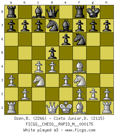 Last move : 1/2-1/2 2025 November 3 7:18:27 [Event "FICGS__CHESS__RAPID_M__000175"] [Site "FICGS"] [Date "2025.10.03"] [Round "1"] [White "Ozen,Bahadir"] [Black "Cleto Junior,Dirceu"] [Result "1/2-1/2"] [WhiteElo "2266"] [BlackElo "2115"] 1.d4 Nf6 2.Nf3 e6 3.c4 Be7 4.Nc3 d5 5.Bf4 O-O 6.e3 Nbd7 7.a3 c5 8.cxd5 Nxd5 9.Nxd5 exd5 10.dxc5 Nxc5 11.Be5 Bf5 12.Be2 Bf6 13.Bxf6 Qxf6 14.Nd4 Ne6 15.O-O Nxd4 16.Qxd4 Qxd4 17.exd4 Rae8 18.Bb5 Rc8 19.Rfc1 a6 20.Bf1 Rfe8 21.f3 1/2-1/2 Follow this game move after move (download)Chess is like life. (Boris Spassky) Warum muß ich gegen diesen IDIOTEN verlieren? (Aaron Nimzowitsch) EL Ajedrez es como la vida. (Boris Spassky) Les échecs, c'est l'art d'analyser. (Mikhail Botvinnik) Memory... is the diary that we all carry with us. (Oscar Wilde, The Importance of Being Earnest)