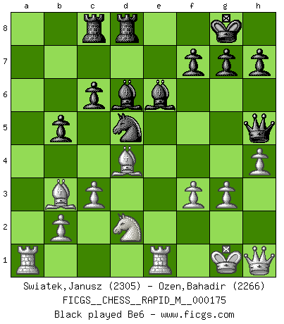 Last move : 1/2-1/2 2025 December 1 20:11:58 [Event "FICGS__CHESS__RAPID_M__000175"] [Site "FICGS"] [Date "2025.10.03"] [Round "1"] [White "Swiatek,Janusz"] [Black "Ozen,Bahadir"] [Result "1/2-1/2"] [WhiteElo "2305"] [BlackElo "2266"] 1.e4 e5 2.Nf3 Nc6 3.Bb5 a6 4.Ba4 Nf6 5.O-O Be7 6.Re1 b5 7.Bb3 O-O 8.c3 d5 9.exd5 Nxd5 10.Nxe5 Nxe5 11.Rxe5 c6 12.Re1 Bd6 13.d3 Bf5 14.Qf3 Qh4 15.g3 Qh3 16.Be3 Bxd3 17.Nd2 Bf5 18.Bd4 Rfd8 19.a4 Bg4 20.Qh1 Qh5 21.h4 Rac8 22.axb5 axb5 23.f3 Be6 24.g4 Qh6 25.Ne4 Bc7 26.h5 Nf4 27.Bxe6 Nxe6 1/2-1/2 Follow this game move after move (download)By this measure (on the gap between Fischer & his contemporaries), I consider him the greatest world champion. (Garry Kasparov) Wir können eben der zündenden Macht des Opfers nicht wiederstehen, denn die Begeisterung für das Opfer liegt in der Natur des Menschen. (Rudolf Spielmann) Yo considero que Fischer es uno de los expertos mas grandes de aperturas de siempre. (Keith Hayward) Toute estimation doit être constamment réévaluée. (Jacob Estrin) If only people were all showed a certain minimum level of niceness; if only people didn't retract verbal draw offers (without draw box ticked) on ficgs; if only people didn't kill; if only people didn't run concentration / extermination camps, if only people didn't drop nuclear bombs on Hiroshima and Nagasaki, and so on - it would be a much more beautiful world. But sadly, things are not so... (Normajean Yates)