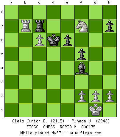 Last move : 1/2-1/2 2025 December 21 13:5:4 [Event "FICGS__CHESS__RAPID_M__000175"] [Site "FICGS"] [Date "2025.10.03"] [Round "1"] [White "Cleto Junior,Dirceu"] [Black "Pineda,Ulises"] [Result "1/2-1/2"] [WhiteElo "2115"] [BlackElo "2243"] 1.d4 Nf6 2.Bg5 d5 3.e3 c5 4.c3 Qb6 5.Qb3 Qd8 6.Nf3 e6 7.Bxf6 gxf6 8.Be2 Nc6 9.dxc5 Bxc5 10.O-O Bd7 11.Nbd2 f5 12.Rac1 O-O 13.c4 d4 14.exd4 Nxd4 15.Nxd4 Bxd4 16.Nf3 Bg7 17.Qxb7 Rb8 18.Qxa7 Rxb2 19.Rfd1 Rxe2 20.c5 Bh6 21.Rb1 Qc8 22.Rxd7 Rc2 23.Rc7 Rxa2 24.Rxc8 Rxa7 25.Rxf8+ Kxf8 26.c6 Rc7 27.Rb8+ Ke7 28.Rb7 Kd6 29.Ne5 Bf4 30.Nxf7+ 1/2-1/2 Follow this game move after move (download)Suddenly it was obvious to me in my analysis I had missed what Fischer had found with the greatest of ease at the board. (Mikhail Botvinnik) Ein Isolani verdüstert die Stimmung auf dem ganzen Schachbrett. (Savielly Grigorievitsch Tartakower) Sin errores no puede haber brillantez. (Emanuel Lasker) Le jeu d'échecs est comme rejeté hors du temps. (Antoine de Saint-Exupéry) All war is based on deception. (Sun Tzu)