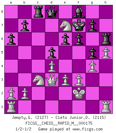 Last move : 1/2-1/2 2025 October 23 17:1:15 [Event "FICGS__CHESS__RAPID_M__000175"] [Site "FICGS"] [Date "2025.10.03"] [Round "1"] [White "Jempty,George"] [Black "Cleto Junior,Dirceu"] [Result "1/2-1/2"] [WhiteElo "2127"] [BlackElo "2115"] 1.d4 d5 2.c4 c6 3.cxd5 cxd5 4.Bf4 Nc6 5.e3 Nf6 6.Bd3 Bg4 7.f3 Bh5 8.Nc3 a6 9.Nge2 Bg6 10.Bxg6 hxg6 11.h4 e6 12.Kf2 Nh5 13.Bg5 f6 14.Qc2 Kf7 15.Bf4 Nb4 16.Qb1 Rc8 17.g4 Nxf4 18.Nxf4 Rh6 19.h5 g5 20.Ng6 Nc6 21.Qd3 Ne7 22.Nxe7 1/2-1/2 Follow this game move after move (download)The enormous mental resilience, without which no Chess player can exist, was so much taken up by Chess that he could never free his mind of this game. (Albert Einstein) Den Ruhm habe ich schon, jetzt brauche ich noch das Geld. (Wilhelm Steinitz) Debió haber existido una vez en que los hombres eran semidióses, de otra manera no hubiesen podido inventar el Ajedrez. (Gustav Schenk) On peut tirer plus d'utilité d'une partie perdue que de 100 parties gagnées. (Capablanca) Computers have lots of memory but no imagination. (Anonymous)