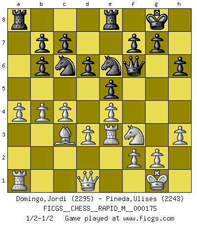 Last move : 1/2-1/2 2025 November 16 23:26:6 [Event "FICGS__CHESS__RAPID_M__000175"] [Site "FICGS"] [Date "2025.10.03"] [Round "1"] [White "Domingo,Jordi"] [Black "Pineda,Ulises"] [Result "1/2-1/2"] [WhiteElo "2295"] [BlackElo "2243"] 1.e4 e5 2.Nf3 Nc6 3.Bc4 Nf6 4.d3 Bc5 5.Nc3 d6 6.Na4 Bb6 7.a3 h6 8.h3 O-O 9.Nxb6 axb6 10.O-O Re8 11.Re1 Be6 12.Bxe6 Rxe6 13.c4 Re8 14.Bd2 Nh7 15.b4 Qf6 16.Re3 Nf8 17.Bc3 Ne6 18.a4 Qg6 19.Nh4 Qf6 20.Nf3 Qg6 21.Nh4 Qf6 22.Nf3 1/2-1/2 Follow this game move after move (download)If you aren't afraid of Spassky, then I have removed the element of money. (Jim Slater) Wenn sie aufgeben, dann danke ich Ihnen für das Spiel (Eventualzug beim Fernschach). (Anonymous) Debemos de asegurarnos de que el Ajedrez no se convierta en un lenguaje muerto, muy interesante, pero tan solo para un grupo muy pequeño. (Sytze Faber) Je fais ceci parce que dans cinquante coups j'obtiendrai cela; je m'appelle Mikhail Moisevitch Botvinnik. (Botvinnik) Programming can only do so much before it becomes too much. (Don Groves)