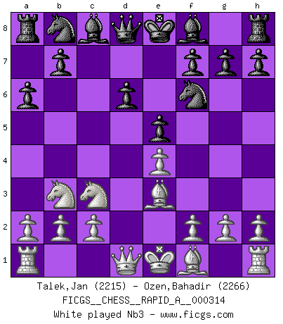 Last move : 1/2-1/2 2025 November 8 23:0:49 [Event "FICGS__CHESS__RAPID_A__000314"] [Site "FICGS"] [Date "2025.10.03"] [Round "1"] [White "Talek,Jan"] [Black "Ozen,Bahadir"] [Result "1/2-1/2"] [WhiteElo "2215"] [BlackElo "2266"] 1.e4 c5 2.Nf3 d6 3.d4 cxd4 4.Nxd4 Nf6 5.Nc3 a6 6.Be3 e5 7.Nb3 Be6 8.f3 h5 9.Nd5 Bxd5 10.exd5 Nbd7 11.Qd2 g6 12.O-O-O Nb6 13.Kb1 Nbxd5 14.Bg5 Be7 15.Bd3 Qc7 16.Rhf1 Nh7 17.Bh6 Nb6 18.Qe2 Bg5 19.Bxg5 Nxg5 20.f4 Ne6 1/2-1/2 Follow this game move after move (download)When asked, -How is that you pick better moves than your opponents?, I responded: I'm very glad you asked me that, because, as it happens, there is a very simple answer. I think up my own moves, and I make my opponent think up his. (Alexander Alekhine) Fischer ist das größte Genie, das je vom Schachhimmel heruntergestiegen ist. (Mikhail Nekhemyevich Tal) Para mi, el Ajedrez es la vida y cada partida es como una nueva vida. Todo jugador de Ajedrez suele vivir muchas vidas durante su vida. (Eduard Gufeld) Je crois qu'il existe des manières très spécifiques de jouer efficacement contre une machine. Evidemment, nous n'avons aucune chance en technique pure, parce que l'ordinateur calcule de manière parfaite. Mais lorsque nous faisons appel à notre cerveau, en utilisant l'intuition et la compréhension, alors nous restons beaucoup plus forts. (Anatoli Karpov) All the biggest technological inventions created by man - the airplane, the automobile, the computer - says little about his intelligence, but speaks volumes about his laziness. (Mark Kennedy)