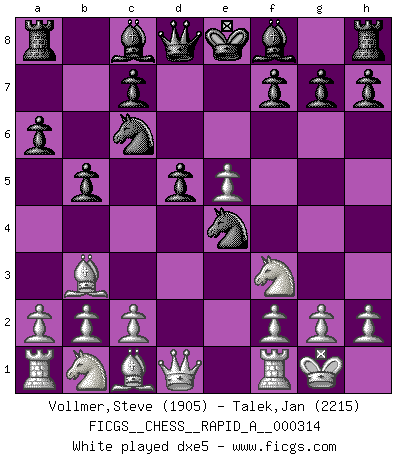 Last move : 0-1 2026 February 3 23:26:8 [Event "FICGS__CHESS__RAPID_A__000314"] [Site "FICGS"] [Date "2025.10.03"] [Round "1"] [White "Vollmer,Steve"] [Black "Talek,Jan"] [Result "0-1"] [WhiteElo "1905"] [BlackElo "2215"] 1.e4 e5 2.Nf3 Nc6 3.Bb5 a6 4.Ba4 Nf6 5.O-O Nxe4 6.d4 b5 7.Bb3 d5 8.dxe5 Be6 9.c3 Be7 10.Re1 O-O 11.Nbd2 Nc5 12.Bc2 d4 13.cxd4 Nxd4 14.Nxd4 Qxd4 15.Nf3 Qxd1 16.Rxd1 Rad8 17.Be3 Rxd1+ 18.Rxd1 Na4 19.Bxa4 bxa4 20.a3 Rb8 21.Bc1 c5 22.Ng5 Bf5 23.f4 c4 24.h3 Bc5+ 25.Kh2 Bd3 26.Nf3 Bf2 27.Nd2 h5 28.g3 Be2 29.Rh1 Bd4 30.Re1 Bd3 31.Kg2 Bxb2 32.Kf3 c3 33.Ne4 Rb3 34.Nc5 Bc2 35.Nxa4 Rxa3 36.Nxb2 cxb2 0-1 Follow this game move after move (download)Daring ideas are like Chess men moved forward. They may be beaten, but they may start a winning game. (Johann Wolfgang von Goethe) Jede Eröffnung ist gut genug um gespielt zu werden, wenn nur ihr Ruf schlecht genug ist. (Savielly Grigorievitsch Tartakower) Peones: ellos son el alma de esta partida, solos forman el ataque y la defensa. (Philidor) Ce n'est pas pour s'amuser qu'il joue aux échecs : il célèbre un culte. (Vladimir Nabokov) Thibault, I ask for draw. Game 13876. - Sorry Ilmars, you won. (FICGS chat)