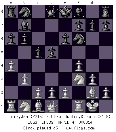 Last move : 1/2-1/2 2025 November 8 23:1:12 [Event "FICGS__CHESS__RAPID_A__000314"] [Site "FICGS"] [Date "2025.10.03"] [Round "1"] [White "Talek,Jan"] [Black "Cleto Junior,Dirceu"] [Result "1/2-1/2"] [WhiteElo "2215"] [BlackElo "2115"] 1.f4 d5 2.Nf3 a6 3.g3 Nf6 4.Bg2 e6 5.a4 b6 6.O-O Bb7 7.b3 c5 8.Bb2 Be7 9.e3 Nc6 10.Qe2 O-O 11.Ne5 h6 12.d3 b5 13.Nd2 Nxe5 14.Bxe5 Bc6 15.axb5 axb5 16.Nf3 Nd7 17.h4 Qb6 18.Bb2 Rxa1 19.Rxa1 Qb7 20.Ne5 Nxe5 21.Bxe5 Rd8 22.Qg4 Bf8 23.Qe2 Qe7 1/2-1/2 Follow this game move after move (download)Chess makes man wiser and clear-sighted. (Vladimir Putin) Ich glaube, ich kenne inzwischen die Gründe für mein Versagen: schachliche Charakterfehler. Ich war nie ein Wunderkind und in meiner gesamten menschlichen Entwicklung immer zu langsam. (Viktor Kortschnoi) Creo que una cierta cantidad de temperamento es esperada de los genios del Ajedrez. (Ron Gross) Shah mat. Le roi est mort. Cri de fierté d'un joueur venant de terrasser son adversaire, courtoisement, sans effusion de sang. Are you threatening me, Master Jedi ? (Chancellor Palpatine in Star Wars ep.3)
