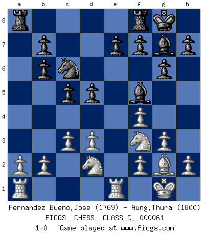 Last move : 1-0 2008 January 22 11:36:38 [Event "FICGS__CHESS__CLASS_C__000061"] [Site "FICGS"] [Date "2007.10.07"] [Round "1"] [White "Fernandez Bueno,Jose"] [Black "Aung,Thura"] [Result "1-0"] [WhiteElo "1769"] [BlackElo "1800"] 1.Nf3 d5 2.d3 Nf6 3.g3 c5 4.Bg2 Nc6 5.O-O g6 6.Bf4 Bg7 7.c3 O-O 8.Nbd2 Nh5 9.e3 Qb6 10.Qb3 Nxf4 11.exf4 Bf5 12.Qxb6 axb6 13.Rfe1 1-0 Reti : Old Indian attack Kingside Castling by player White (move 5) Kingside Castling by player Black (move 7) Player White won this chess game. Follow this game move after move (download)There is only one thing Fischer does in Chess without pleasure: to lose ! (Boris Spassky) Der Partner hat auch seine Existenzberechtigung. (Savielly Grigorievitsch Tartakower) Juega la Apertura como un libro, el Juego Medio como un mago y los Finales como una máquina. (Spielmann) Ne tendez aucun piège pour le plaisir ! Ne jouez rien dans l'espoir que l'adversaire réagisse de façon stupide ! Prenez toujours pour acquis que l'adversaire va trouver le meilleur coup ! Ne jouez jamais de coup dans l'espoir que l'adversaire ne voie pas la menace ! Chacun de vos coups doit améliorer la position d'une façon ou d'une autre. Sometimes it pays to stay in bed in Monday, rather than spending the rest of the week debugging Monday's code. (Dan Salomon)