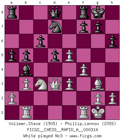 Last move : 0-1 2025 December 27 21:15:23 [Event "FICGS__CHESS__RAPID_A__000314"] [Site "FICGS"] [Date "2025.10.03"] [Round "1"] [White "Vollmer,Steve"] [Black "Phillip,Lennox"] [Result "0-1"] [WhiteElo "1905"] [BlackElo "2055"] 1.d4 Nf6 2.c4 e6 3.Nf3 d5 4.cxd5 exd5 5.Nc3 c6 6.Bg5 h6 7.Bh4 Bf5 8.e3 Nbd7 9.Bd3 Bxd3 10.Qxd3 Be7 11.O-O O-O 12.Ne5 Nxe5 13.dxe5 Nd7 14.Bg3 Qb6 15.Rab1 a5 16.b3 Bb4 17.Na4 Qd8 18.f4 b5 19.Nc3 f6 20.Rbc1 Ba3 21.Rc2 fxe5 22.fxe5 Qg5 23.Bf4 Nxe5 24.Qd4 Qg6 25.e4 Nd7 26.Ne2 Rae8 27.Ng3 h5 28.Qd1 h4 29.Qh5 Bc5+ 30.Rxc5 Qxh5 31.Nxh5 Nxc5 32.exd5 cxd5 33.Rd1 Rf5 34.Bd6 Ne4 0-1 Follow this game move after move (download)An attack on the wing should be met by play in the center. (Nimzovitch) Garry Kasparov war erst in der Großmeister-Organisation GMA, dann in der Profischach-Vereinigung PCA, zum Schluss kehrte er wieder in den Schoß der FIDE zurück. Aber gut, manche Leute sind flexibel (Viswanathan Anand) El Ajedrez es un terrible juego. Si no controlas el centro, tu oponente tiene una posición mas holgada. Si tienes control del centro, ¡entonces realmente tu tienes algo de que preocuparte!. (Siegbert Tarrasch) RxDa4 pat (...) Without enthusiasm, virtue functions not at all, and vice only poorly. (Mignon McLaughlin, The Neurotic's Notebook, 1960)