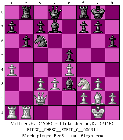 Last move : 0-1 2025 November 22 11:7:1 [Event "FICGS__CHESS__RAPID_A__000314"] [Site "FICGS"] [Date "2025.10.03"] [Round "1"] [White "Vollmer,Steve"] [Black "Cleto Junior,Dirceu"] [Result "0-1"] [WhiteElo "1905"] [BlackElo "2115"] 1.c4 e5 2.Nc3 Nf6 3.d3 Nc6 4.Nf3 d5 5.cxd5 Nxd5 6.g3 Bb4 7.Bd2 Nxc3 8.bxc3 Bd6 9.Bg2 O-O 10.O-O h6 11.Qc2 Rb8 12.a4 b6 13.Rfb1 Bd7 14.e4 Bc5 15.Be3 Bxe3 16.fxe3 Qe7 17.d4 f6 18.Nh4 Kh7 19.Nf5 Qf7 20.d5 Na5 21.c4 Nb7 22.Bf3 a5 23.g4 Nc5 24.h4 g6 25.Ng3 Qe8 26.Bd1 h5 27.gxh5 f5 28.exf5 gxf5 29.Kh2 Rg8 30.e4 f4 31.Nf1 Qe7 32.Qf2 Nd3 33.Qf3 Qxh4+ 34.Qh3 Qxh3+ 0-1 Follow this game move after move (download)A good player is always lucky. (Jose Raul Capablanca) Du weisst es gibt ein Problem mit Computern und Fernschach, wenn jeder eine Rating von 2450 hat. (John Christen Knudsen) La pasion por jugar al Ajedrez es una de las mas inexplicables en el mundo. (H.G. Wells) Le pion, dans sa simplicité, marche droit devant lui, mais lorsqu'il prend, il le fait obliquement? Ainsi l'homme, tant qu'il reste pauvre, marche dans la droiture et vit honnêtement, mais lorsqu'il recherche les honneurs, il flatte, se parjure et, par les voies obliques, cherche une position supérieure sur l'échiquier du monde. (Jean de Galles) Information on the Internet is subject to the same rules and regulations as conversation at a bar. (George Lundberg)
