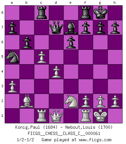 Last move : 1/2-1/2 2007 December 22 19:43:19 [Event "FICGS__CHESS__CLASS_C__000061"] [Site "FICGS"] [Date "2007.10.07"] [Round "1"] [White "Konig,Paul"] [Black "Nebout,Louis"] [Result "1/2-1/2"] [WhiteElo "1684"] [BlackElo "1700"] 1.d4 d5 2.c4 e6 3.Nc3 Nf6 4.Nf3 Be7 5.e3 O-O 6.b3 c5 7.Bd3 cxd4 8.exd4 b6 9.O-O Bb7 10.Bb2 dxc4 11.bxc4 Na6 12.Ne5 Nb4 13.Be2 Rc8 14.a3 Nc6 15.Bf3 Na5 16.Bxb7 Nxb7 17.Rc1 Nd7 18.Nxd7 Qxd7 19.Ne2 Na5 20.c5 1/2-1/2 QGD : 4.Nf3 Kingside Castling by player Black (move 5) Kingside Castling by player White (move 9) This chess game ended in a draw. Follow this game move after move (download)When you play Bobby, it is not a question if you win or lose. It is a question if you survive. (Boris Spassky) Ohne ihre Erfolge schmälern zu wollen würde ich sagen Petrosian, Spassky und Karpov verdanken ihre Siege ihren Trainern - Boleslavsky, Bondarevsky und Furman. (Mikhail Moiseyevich Botvinik) Solo el jugador con la iniciativa tiene el derecho a atacar. (Wilhelm Steinitz) L'ordinateur a tué l'originalité. Il n'y a plus guère d'aventures sur l'échiquier. (Jacob Murray) O divine art of subtlety and secrecy! Through you we learn to be invisible, through you inaudible and hence we can hold the enemy's fate in our hands. (Sun Tzu)
