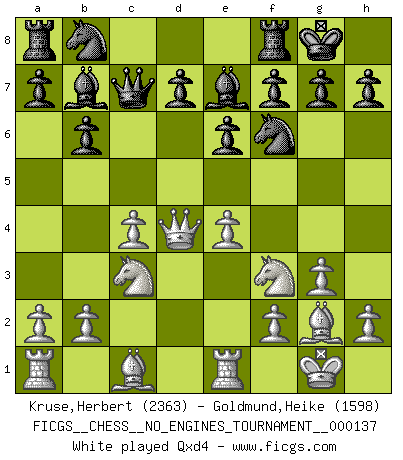 Last move : 1-0 2025 December 7 12:53:11 [Event "FICGS__CHESS__NO_ENGINES_TOURNAMENT__000137"] [Site "FICGS"] [Date "2025.10.04"] [Round "1"] [White "Kruse,Herbert"] [Black "Goldmund,Heike"] [Result "1-0"] [WhiteElo "2363"] [BlackElo "1598"] 1.Nf3 Nf6 2.c4 b6 3.g3 Bb7 4.Bg2 c5 5.O-O e6 6.Nc3 Be7 7.Re1 O-O 8.e4 Qc7 9.d4 cxd4 10.Qxd4 d6 11.Nb5 Qc5 12.Qxc5 bxc5 13.Nc7 Nc6 14.Nxa8 Bxa8 15.e5 Nxe5 16.Nxe5 Bxg2 17.Kxg2 dxe5 18.Rxe5 Bd6 19.Re2 Ng4 20.Bf4 e5 21.Bd2 f6 22.h3 Nh6 23.Bxh6 gxh6 24.Rd1 Bc7 25.Rd7 Bb6 26.f4 Rf7 27.Rxf7 Kxf7 28.fxe5 fxe5 29.Rxe5 Kf6 30.Rd5 Kg6 31.Kf3 h5 32.h4 h6 33.a3 1-0 Follow this game move after move (download)Even the laziest King flees wildly in the face of a double check ! (Aaron Nimzowitsch) Was ist der Unterschied zwischen einem Strassenarbeiter und einem Schachspieler? --Der Schachspieler bewegt sich ab und zu. (Anonymous) Vive, pierde y aprende al observar a tu oponente como gana. (Amber Steenbock) Les Echecs ne sont pas pour les âmes timides. Ils requièrent un homme entier, qui ne s'arrête pas aveuglément à ce qui a été déjà établi, mais qui tente individuellement de sonder les profondeurs du jeu. (W. Steinitz) Every now and then a man's mind is stretched by a new idea and never shrinks back to its former dimensions. (Oliver Wendell Holmes, Sr.)