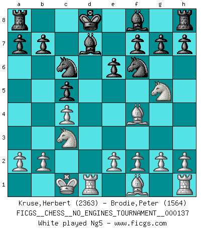Last move : 1-0 2025 October 26 18:50:3 [Event "FICGS__CHESS__NO_ENGINES_TOURNAMENT__000137"] [Site "FICGS"] [Date "2025.10.04"] [Round "1"] [White "Kruse,Herbert"] [Black "Brodie,Peter"] [Result "1-0"] [WhiteElo "2363"] [BlackElo "1564"] 1.Nf3 Nf6 2.c4 c5 3.d4 d6 4.dxc5 dxc5 5.Qxd8+ Kxd8 6.Nc3 Nc6 7.Bf4 e6 8.O-O-O Bd7 9.Ng5 Be7 10.Nxf7+ Ke8 11.Nxh8 Nh5 12.Bg3 Nxg3 13.hxg3 g6 14.Rxh7 Bf6 15.Nxg6 Ne7 16.Nxe7 Bxe7 17.Rh8+ Bf8 18.Rxf8+ Kxf8 19.Rxd7 1-0 Follow this game move after move (download)To avoid losing a piece, many a person has lost the game. (Savielly Tartakover) Wer nie einen Fehler gemacht hat, hat nie etwas Neues ausprobiert. (Albert Einstein) a manera como él juega al Ajedrez, demuestra la completa naturaleza de un hombre. (Stanley Ellin) C'est une question de caractère, Beaucoup de gens perdent leur motivation très vite. D'autres, ils sont rares, peuvent la conserver très longtemps. J'aime les échecs, encore aujourd'hui je suis heureux d'analyser des parties. J'aime toujours gagner, je déteste encore perdre. Bien jouer est important pour mon intégrité intellectuelle et morale. Et puis les échecs vivent en ce moment une période historique grâce à Internet. Ils se développent dans les systèmes éducatifs à travers le monde. Ils sortent de leur ghetto, et c'est mon rôle de mener à bien cette révolution. (Gary Kasparov) Once you start thinking you have nothing left to learn, you have everything to learn. (Steve Badget)