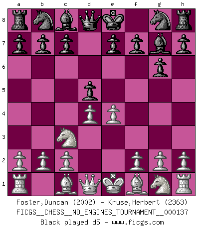 Last move : 0-1 2025 November 26 0:40:31 [Event "FICGS__CHESS__NO_ENGINES_TOURNAMENT__000137"] [Site "FICGS"] [Date "2025.10.04"] [Round "1"] [White "Foster,Duncan"] [Black "Kruse,Herbert"] [Result "0-1"] [WhiteElo "2002"] [BlackElo "2363"] 1.e4 g6 2.d4 Bg7 3.Nc3 d5 4.exd5 Nf6 5.Bc4 Nbd7 6.Nf3 O-O 7.O-O Nb6 8.Bb3 a5 9.a3 a4 0-1 This chess game has been lost on time (started : 2025.10.04 1:58:47) Follow this game move after move (download)Capture of the adverse King is the ultimate but not the first object of the game. (William Steinitz) Ich hatte Zahnschmerzen im ersten Spiel. In der zweiten Partie tat mir der Kopf weh. In der dritten war es eine Rheuma-Attacke und während der vierten fühlte ich mich nicht gut. Und in der fünften? Nun, man muss doch nicht jedes Spiel gewinnen, oder? (Savielly Grigorievitsch Tartakower) El Ajedrez es un expediente tonto que hace creer a la gente inactiva que hacen una cosa muy astuta cuando solamente estan perdiendo su tiempo. (George Bernard Shaw) Shah mat. Le roi est mort. Cri de fierté d'un joueur venant de terrasser son adversaire, courtoisement, sans effusion de sang. The Internet is the world's largest library. It's just that all the books are on the floor. (John Allen Paulos)