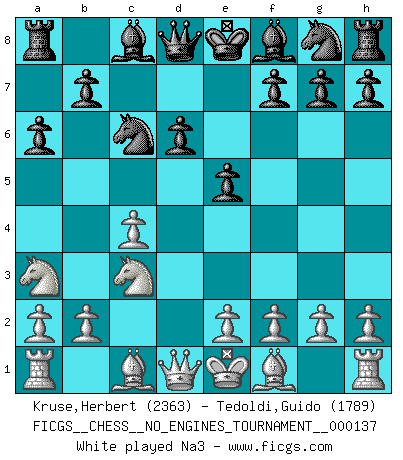 Last move : 1-0 2026 January 17 22:33:34 [Event "FICGS__CHESS__NO_ENGINES_TOURNAMENT__000137"] [Site "FICGS"] [Date "2025.10.04"] [Round "1"] [White "Kruse,Herbert"] [Black "Tedoldi,Guido"] [Result "1-0"] [WhiteElo "2363"] [BlackElo "1789"] 1.Nf3 c5 2.c4 Nc6 3.d4 cxd4 4.Nxd4 e5 5.Nb5 d6 6.N1c3 a6 7.Na3 Be6 8.e4 h6 9.Nc2 Nf6 10.Be2 Be7 11.O-O O-O 12.b3 Rc8 13.Qd2 Nh7 14.Ba3 f5 15.Rad1 Rc7 16.Bxd6 Rd7 17.c5 Bxd6 18.cxd6 Ng5 19.exf5 Bxf5 20.Ne3 Nd4 21.Nxf5 Nxf5 22.Qd5+ Kh8 23.Ne4 Nxe4 24.Qxe4 Nxd6 25.Qxe5 Re8 26.Qh5 Rde7 27.Bd3 Re6 28.Bb1 Qe7 29.h3 Nb5 30.Qf5 g6 31.Qf4 Qg7 32.Bd3 Nc3 33.Ra1 Nd5 34.Qf3 Nb4 35.Bc4 Re5 36.Rfd1 Nc2 37.Rac1 Re1+ 38.Rxe1 Nxe1 39.Qf7 Qe5 40.Qxg6 1-0 Follow this game move after move (download)I'd rather have a Pawn than a finger. (Reuben Fine) Wenn Spassky eine Figur opfert kannst du genauso gut aufgeben. Aber wenn Tal eine Figur opfert, spiel weiter. Er könnte noch eine weitere opfern, und dann ... wer weiß? (Miguel Najdorf) La batalla por la última verdad nunca sera ganada. Y es por eso que el Ajedrez es tan fascinante. (Hans Kmoch) Avec des compensations pour le matériel en plus... (Anonyme) I'll be back. (Arnold Schwarzenegger)