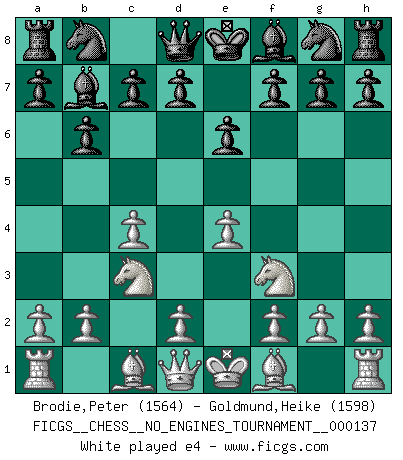 Last move : cxd5 2026 January 18 19:50:41 White clock - 28 days 17:45:19 Black clock - 34 days 11:22:51 [Event "FICGS__CHESS__NO_ENGINES_TOURNAMENT__000137"] [Site "FICGS"] [Date "2025.10.04"] [Round "1"] [White "Brodie,Peter"] [Black "Goldmund,Heike"] [Result "*"] [WhiteElo "1564"] [BlackElo "1598"] 1.c4 b6 2.Nc3 Bb7 3.Nf3 e6 4.e4 Nf6 5.Be2 Nxe4 6.O-O Nxc3 7.dxc3 c5 8.Bf4 Be7 9.Qc2 O-O 10.Rad1 d6 11.Qd2 d5 12.cxd5 * Follow this game move after move (download)Chess is no whit inferior to the violin, and we have a large number of professional violinists. (Mikhail Botvinnik) Im Schach nämlich geht es darum, daß Ich des Gegners klein zu kriegen, sein Ego zu zerbrechen und zu zermahlen, seine Selbstachtung zu zertreten und zu verscharren und seine ganze mißachtenswerte sogenannte Persönlichkeit ein für alle Mal tot zu hacken und zu zerstampfen und dadurch die menschliche Gesellschaft von einer stinkenden Pestbeule zu befreien. Es ist ein königliches Spiel. (Robert James Fischer) ¿Porque tengo que perder ante este idiota?. (Aron Nimzovich) La conception d'un plan est le processus par lequel un joueur exploite les avantages de sa position tout en s'efforçant d'en réduire au minimum les inconvénients. Afin de garantir le succès, un plan doit toujours se fonder sur un diagnostic objectif des particularités d'une position. La conception d'un plan est d'autant plus difficile que la position est équilibrée, et grandement facilitée lorsqu'il n'existe qu'un seul plan susceptible de répondre aux exigences de la position. (Harry Golombek) Creativity involves breaking out of established patterns in order to look at things in a different way. (Edward De Bono)
