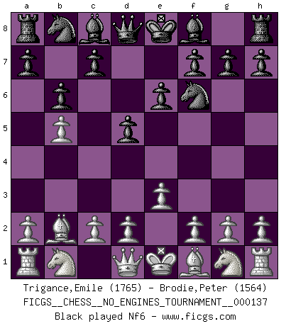 Last move : 0-1 2025 November 30 8:59:30 [Event "FICGS__CHESS__NO_ENGINES_TOURNAMENT__000137"] [Site "FICGS"] [Date "2025.10.04"] [Round "1"] [White "Trigance,Emile"] [Black "Brodie,Peter"] [Result "0-1"] [WhiteElo "1765"] [BlackElo "1564"] 1.b4 d5 2.Bb2 e6 3.b5 b6 4.e3 Nf6 0-1 This chess game has been lost on time (started : 2025.10.04 1:58:47) Follow this game move after move (download)Examine moves that smite! A good eye for smites is far more important than a knowledge of strategical principles. (Purdy) In Buenos Aires ist es nicht mein vorrangiges Ziel ein starkes Turnier zu organisieren, sondern ein Turnier für Gentlemen. Ich würde nie Kamsky einladen. Ich mag keine Probleme. (Miguel Najdorf) No nos podemos resistir a la fascinación de un sacrificio ya que la pasión por los sacrificios es parte de la naturaleza de un jugador de Ajedrez. (Rudolf Spielman) Karpov est une pièce de musée. (Garry Kasparov) The greatest con, that he ever pulled... was making you believe... that he is you. (Revolver, movie)