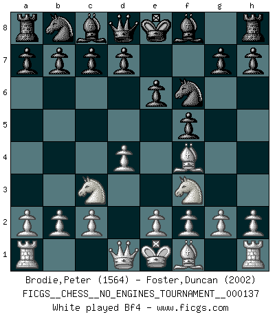 Last move : 1-0 2025 December 1 13:51:19 [Event "FICGS__CHESS__NO_ENGINES_TOURNAMENT__000137"] [Site "FICGS"] [Date "2025.10.04"] [Round "1"] [White "Brodie,Peter"] [Black "Foster,Duncan"] [Result "1-0"] [WhiteElo "1564"] [BlackElo "2002"] 1.Nf3 f5 2.d4 Nf6 3.Nc3 e6 4.Bf4 Bb4 5.Qd3 O-O 6.O-O-O d6 7.a3 Bxc3 8.Qxc3 1-0 This chess game has been lost on time (started : 2025.10.04 1:58:47) Follow this game move after move (download)Chess is the gymnasium of the mind. (Blaise Pascal) Ich habe Kasparov in Rente geschickt. (Veselin Topalov) Uno no tiene que jugar muy bien, es suficiente jugar mejor que el oponente. (Siegbert Tarrasch) Psychologiquement, tu dois avoir confiance en toi même, mais cette confiance doit être basée sur des faits. (Robert Fischer) A bird doesn't sing because it has an answer, it sings because it has a song. (Maya Angelou)