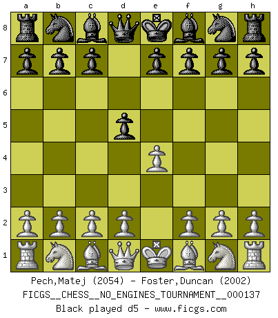 Last move : 1-0 2026 January 1 6:58:5 [Event "FICGS__CHESS__NO_ENGINES_TOURNAMENT__000137"] [Site "FICGS"] [Date "2025.10.04"] [Round "1"] [White "Pech,Matej"] [Black "Foster,Duncan"] [Result "1-0"] [WhiteElo "2054"] [BlackElo "2002"] 1.e4 d5 2.exd5 Qxd5 3.Nc3 Qd6 4.d4 1-0 This chess game has been lost on time (started : 2025.10.04 1:58:47) Follow this game move after move (download)Chess is war over the board. The object is to crush the opponents mind. (Bobby Fischer) Ohne Leiden bildet sich kein Charakter. (Ernst Freiherr von Feuchtersleben) El Ajedrez hace al hombre ser mas sabio y ver mas claro. (Vladimir Putin) Il vaut mieux sacrifier les pièces de l'adversaire. (Xavier Tartacover) To steal ideas from one person is plagiarism. To steal from many is research. (Unknown)