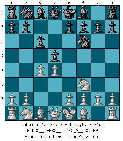Last move : 1/2-1/2 2025 November 23 0:1:18 [Event "FICGS__CHESS__CLASS_M__000159"] [Site "FICGS"] [Date "2025.10.09"] [Round "1"] [White "Taboada,Pedro Pablo"] [Black "Ozen,Bahadir"] [Result "1/2-1/2"] [WhiteElo "2271"] [BlackElo "2266"] 1.d4 Nf6 2.Nf3 d5 3.c4 c6 4.Nc3 e6 5.e3 Nbd7 6.Qc2 Bd6 7.b3 O-O 8.Be2 b6 9.O-O Bb7 10.Bb2 Re8 11.Rad1 Qe7 12.Rfe1 Rad8 13.Bf1 c5 14.cxd5 exd5 15.g3 Rc8 16.Qb1 c4 17.bxc4 dxc4 18.Nd2 Bb4 19.Bh3 Bxc3 20.Bxc3 Ne4 21.Nxe4 Bxe4 22.Qb5 Bc6 1/2-1/2 Follow this game move after move (download)A thorough understanding of the typical mating continuations makes the most complicated sacrificial combinations leading up to them not only not difficult, but almost a matter of course. (Siegbert Tarrasch) Gewinnen beim Schach fördert das Selbstvertrauen. Beim Sex spüre ich sowas nicht... (Garry Kasparov) El Ajedrez, como cualquier otra actividad creativa, puede existir solo a través de méritos combinados de aquellos que tienen talento creativo y de aquellos que tienen la habilidad de organizar un trabajo creativo. (Mikhail Botvinnik) Votre seul travail dans les ouvertures est d'obtenir un milieu de partie jouable. (Lajos Portish) When you stop learning you start dying. (M. Scott Adams)