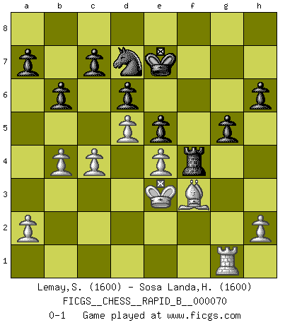 Last move : 0-1 2007 November 9 2:53:9 [Event "FICGS__CHESS__RAPID_B__000070"] [Site "FICGS"] [Date "2007.10.07"] [Round "1"] [White "Lemay,Simon"] [Black "Sosa Landa,Hugo Rafael"] [Result "0-1"] [WhiteElo "1600"] [BlackElo "1600"] 1.c4 f5 2.d4 Nf6 3.Nc3 e6 4.Bg5 b6 5.Nf3 Bb4 6.Qb3 Bxc3+ 7.Qxc3 Bb7 8.Ne5 O-O 9.Qg3 d6 10.Bh6 Qe7 11.Nf3 Ne4 12.Bg5 Nxg3 13.Bxe7 Nxh1 14.Bxf8 Bxf3 15.gxf3 Kxf8 16.Bg2 Nxf2 17.Kxf2 Nd7 18.e4 fxe4 19.fxe4 Ke7 20.Ke3 Rf8 21.Rg1 g5 22.Bf3 h6 23.b4 e5 24.d5 Rf4 0-1 English : Anglo-Dutch defense Kingside Castling by player Black (move 8) Player Black won this chess game. Follow this game move after move (download)The tactician must know what to do whenever something needs doing; the strategist must know what to do when nothing needs doing. (Savielly Tartakover) Je älter ich werde, um so mehr schätze ich die Bauern. (Paul Keres) Un buen jugador siempre tiene buena suerte. (José Raúl Capablanca) Les sacrifices démontrent seulement que quelqu'un a gaffé. (Savielly Tartacover) The real voyage of discovery consists not in seeking new lands but in seeing with new eyes. (Marcel Proust)