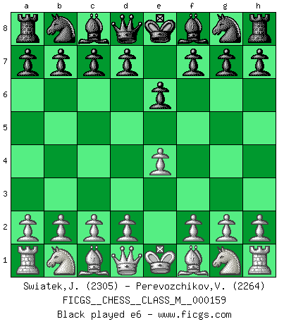 Last move : 1/2-1/2 2026 January 18 13:26:46 [Event "FICGS__CHESS__CLASS_M__000159"] [Site "FICGS"] [Date "2025.10.09"] [Round "1"] [White "Swiatek,Janusz"] [Black "Perevozchikov,Vjacheslav"] [Result "1/2-1/2"] [WhiteElo "2305"] [BlackElo "2264"] 1.e4 e6 2.d4 d5 3.Nc3 Nf6 4.Bg5 h6 5.Bxf6 Qxf6 6.a3 c6 7.Nf3 Nd7 8.h4 dxe4 9.Nxe4 Qf4 10.Bd3 Be7 11.Qe2 b6 12.g3 Qc7 13.O-O-O Bb7 14.Rhe1 O-O 15.Ne5 Rad8 16.Nc3 Nxe5 17.dxe5 c5 18.f4 Qc6 19.Be4 Qc8 20.Kb1 Bxe4 21.Nxe4 Rxd1+ 22.Rxd1 Rd8 23.h5 b5 24.Ka2 c4 25.Rxd8+ Qxd8 26.Qf2 Qd5 27.Nc3 Qb7 28.Qd4 a6 29.g4 Qg2 30.Qe4 Qxg4 31.Qa8+ Kh7 32.Qb7 Bf8 33.Qxa6 g6 34.Ne4 1/2-1/2 Follow this game move after move (download)I believe that Chess possesses a magic that is also a help in advanced age. A rheumatic knee is forgotten during a game of Chess and other events can seem quite unimportant in comparison with a catastrophe on the chessboard. (Vlastimil Hort) Früher wurde jeder komplizierte Zug, jedes interessante Opfer mit großem Beifall und Enthusiasmus aufgenommen. Heute schaltet man einfach seinen Fritz an, und man kann sehen, was los ist, ob der Zug geht oder nicht. (Vladimir Kramnik) Los problemas de Ajedrez exigen del compositor las mismas virtudes que caracterizan todo el arte de valor: originalidad, invención, concisión, armonía, complejidad e insinceridad explendida. (Vladimir Nabokov) Les Echecs sont et restent toujours un combat, un combat intégral comme la boxe, la lutte ou un autre sport, et où il doit y avoir un vainqueur et un vaincu. (Joseph Emil Diemer) The production of too many useful things results in too many useless people. (Karl Marx)
