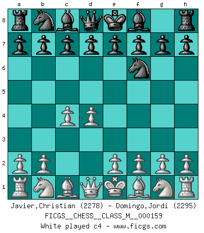 Last move : 1-0 2026 January 18 23:4:42 [Event "FICGS__CHESS__CLASS_M__000159"] [Site "FICGS"] [Date "2025.10.09"] [Round "1"] [White "Javier,Christian"] [Black "Domingo,Jordi"] [Result "1-0"] [WhiteElo "2278"] [BlackElo "2295"] 1.d4 Nf6 2.c4 e5 3.dxe5 Ng4 4.e4 Nxe5 5.Nc3 Bb4 6.f4 Bxc3+ 7.bxc3 Nec6 8.Nf3 Qe7 9.e5 b6 10.a4 Na6 11.Ba3 Nc5 12.Bd3 Bb7 13.O-O O-O-O 14.Be4 d6 15.Bxc5 dxc5 16.Qb1 Na5 17.Bxb7+ Nxb7 18.a5 Nxa5 19.Qe4 c6 20.h4 Qd7 21.f5 Rhe8 22.Rae1 f6 23.h5 h6 24.Qg4 Qf7 25.Qg6 Qxg6 26.fxg6 1-0 Follow this game move after move (download)Chess is not like life... it has rules ! (Mark Pasternak) Mutter, ich bin eben Ex-Weltmeister geworden. --beim nach Hause Kommen nach dem Verlust des WM-Titels an Mihail Botvinnik -- (Mikhail Nekhemyevich Tal) Cuando estes solo, cuando te sientas un extraño en el mundo, juega al Ajedrez. Esto levantará tu espiritu y será tu consejero de guerra. (Aristóteles) Je ne crois pas en la psychologie, je crois aux bons coups. (Robert Fischer) Being number two sucks. (Andre Agassi)