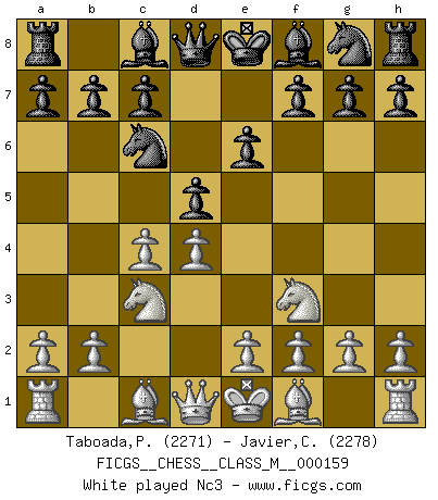 Last move : 1/2-1/2 2026 January 6 19:50:54 [Event "FICGS__CHESS__CLASS_M__000159"] [Site "FICGS"] [Date "2025.10.09"] [Round "1"] [White "Taboada,Pedro Pablo"] [Black "Javier,Christian"] [Result "1/2-1/2"] [WhiteElo "2271"] [BlackElo "2278"] 1.d4 d5 2.Nf3 Nc6 3.c4 e6 4.Nc3 Nf6 5.Bg5 dxc4 6.e3 Na5 7.Ne5 c6 8.Nxc4 Nxc4 9.Bxc4 Be7 10.O-O Nd5 11.Bxe7 Qxe7 12.a4 Bd7 13.a5 O-O 14.Ne4 Rfd8 15.Qf3 b6 16.Rfc1 Be8 17.h3 Rab8 18.Qg3 Nb4 19.Ra3 c5 20.dxc5 Bc6 21.Qe5 Bxe4 22.Qxe4 Qxc5 23.R3a1 Qd6 24.b3 bxa5 25.Rxa5 Nd3 26.Bxd3 Qxd3 27.Qxd3 1/2-1/2 Follow this game move after move (download)Could we look into the head of a Chess player, we should see there a whole world of feelings, images, ideas, emotion and passion. (Alfred Binet) Kombinieren und Schwarzhandel gehören verboten. (Savielly Grigorievitsch Tartakower) Una victoria por una combinación errónea, aunque sea espectacular, me llena de horror artístico. (Wilhelm Steinitz) Un millionnaire : 'Monsieur Steinitz ! Vous ne participez aux tournois que pour l'argent, alors que moi je n'y viens que pour l'honneur.' Steinitz : 'Chacun joue pour ce qu'il n'a pas'... It's not a bug - it's an undocumented feature. (Anonymous)