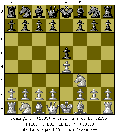 Last move : Rc2 2026 January 19 17:54:1 White clock - 97 days 16:21:16 Black clock - 91 days 19:25:55 (58 days 17:14:13) [Event "FICGS__CHESS__CLASS_M__000159"] [Site "FICGS"] [Date "2025.10.09"] [Round "1"] [White "Domingo,Jordi"] [Black "Cruz Ramirez,Eliecer"] [Result "*"] [WhiteElo "2295"] [BlackElo "2236"] 1.e4 e5 2.Nf3 Nc6 3.Bc4 Bc5 4.b4 Bxb4 5.c3 Ba5 6.d4 d6 7.Qb3 Qd7 8.Nbd2 Bb6 9.O-O Na5 10.Qc2 Nxc4 11.Nxc4 Qc6 12.Nxb6 axb6 13.dxe5 dxe5 14.Nxe5 Qa4 15.Qd3 Nf6 16.Re1 O-O 17.Bg5 Nh5 18.Qe2 f6 19.Qxh5 fxe5 20.Bh4 Ra5 21.Rad1 Qe8 22.Qxe8 Rxe8 23.Bd8 Rc5 24.Re3 Kf7 25.h4 h6 26.h5 Be6 27.Rf3+ Kg8 28.Rg3 Kf7 29.Rf3+ Kg8 30.Rg3 Kh7 31.Rd2 Rc4 32.Re3 Bf7 33.g4 b5 34.f3 b4 35.Bh4 bxc3 36.Rc2 * Follow this game move after move (download)I look one move ahead... the best ! (Siegbert Tarrasch) Ich spiele ehrlich und spiele, um zu gewinnen. Wenn ich verliere nehme ich meine Medizin. (Robert James Fischer) Bobby es la celebridad menos entendida y malinterpretada que camina el la faz de esta tierra. (Yasser Seirawan) L'action d'une oeuvre littéraire se déroule sur un champ de bataille. Les masques et les types du drame moderne correspondent aux pièces du jeu d'échecs. L'intrigue correspond aux coups et aux gambits, c'est à dire aux techniques du jeu telles qu'utilisées et interprétées par les joueurs. Les tactiques et les péripéties [mouvements] correspondent aux coups exécutés par l'adversaire. (Viktor Shklovsky) The real danger is not that computers will begin to think like men, but that men will begin to think like computers. (Sydney J. Harris)