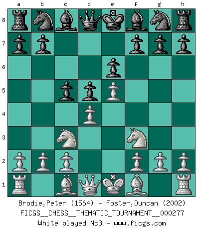 Last move : 1-0 2025 December 3 21:17:44 [Event "FICGS__CHESS__THEMATIC_TOURNAMENT__000277"] [Site "FICGS"] [Date "2025.10.21"] [Round "1"] [White "Brodie,Peter"] [Black "Foster,Duncan"] [Result "1-0"] [WhiteElo "1564"] [BlackElo "2002"] 1.e4 c6 2.d4 d5 3.e5 c5 4.Nf3 e6 5.Nc3 cxd4 6.Nxd4 Bc5 7.Be3 Bxd4 8.Bxd4 Ne7 9.Be2 1-0 This chess game has been lost on time (started : 2025.10.21 20:55:44) Follow this game move after move (download)Don't even mention losing to me. I can't stand to think of it. (Bobby Fischer) Auf jeden Fall musst du zuerst Rechtsanwalt werden, damit du deine eigenen Interessen und die deiner Familie vertreten kannst. [Brief an seinen Sohn] (José Raúl Capablanca) El Ajedrez es imaginación. (David Bronstein) La tactique est l'élément le plus important du milieu de jeu. (Siegbert Tarrasch) The best weapon against an enemy is another enemy. (Friedrich Nietzsche)