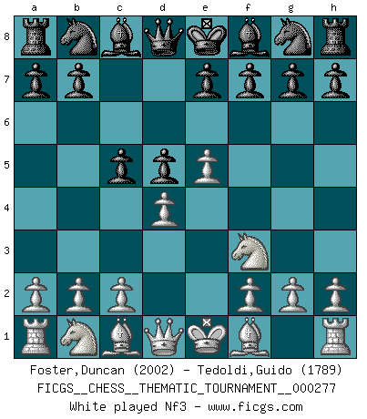Last move : Nc6 2025 December 22 17:18:38 White clock - 10 days 19:55:16 Black clock - 56 days 12:49:58 [Event "FICGS__CHESS__THEMATIC_TOURNAMENT__000277"] [Site "FICGS"] [Date "2025.10.21"] [Round "1"] [White "Foster,Duncan"] [Black "Tedoldi,Guido"] [Result "*"] [WhiteElo "2002"] [BlackElo "1789"] 1.e4 c6 2.d4 d5 3.e5 c5 4.Nf3 e6 5.Bb5+ Bd7 6.Bxd7+ Nxd7 7.O-O Rc8 8.Be3 Ne7 9.Nc3 c4 10.Nb5 Nc6 11.* Follow this game move after move (download)I played Chess with him and would have beaten him sometimes only he always took back his last move, and ran the game out differently. (Mark Twain) Im Reiche der Wirklichkeit ist man nie so glücklich wie im Reiche der Gedanken. (Arthur Schopenhauer) ¿Se han dado cuenta de que Fischer casi nunca ha tenido piezas malas? El las intercambia y las piezas malas se quedan con sus oponenets. (Yuri Balashov) Votre seul travail dans les ouvertures est d'obtenir un milieu de partie jouable. (Lajos Portish) A proverb is a short sentence based on long experience. (Miguel de Cervantes)