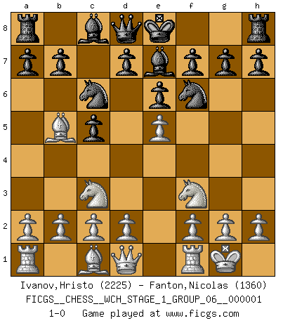 Last move : 1-0 2006 September 6 5:41:28 [Event "FICGS__CHESS__WCH_STAGE_1_GROUP_06__000001"] [Site "FICGS"] [Date "2006.07.01"] [Round "1"] [White "Ivanov,Hristo"] [Black "Fanton,Nicolas"] [Result "1-0"] [WhiteElo "2225"] [BlackElo "1360"] 1.e4 c5 2.Nf3 Nc6 3.Bb5 Nf6 4.Nc3 e6 5.O-O Be7 6.e5 1-0 This chess game has been lost on time (started : 2006.07.01 16:7:34) Sicilian : Nimzovich-Rossolimo attack (without ...d6) Kingside Castling by player White (move 5) Player White won this chess game. Follow this game move after move (download)Chess is ruthless: you've got to be prepared to kill people. (Nigel Short) Es genügt nicht ein guter Spieler zu sein, man muß auch gut spielen. (Siegbert Tarrasch) En la vida, como en el Ajedrez, los Peones propios obstruyen nuestro camino. La gran fortuna de un hombre, su comodidad, placer, hijos, libros, que deberían ayudarle a ganar, con mucha frecuencia lo ponen en Jaque Mate. (Charles Buxton) Les échecs sont un jeu terrible. Si vous n'avez pas le centre, votre adversaire a une position plus libre. Par contre, si vous avez le centre, alors vous avez vraiment quelque chose pour laquelle vous inquiéter ! (Siegbert Tarrasch) In theory there is no difference between theory and practice. In practice there is. (Yogi Berra)