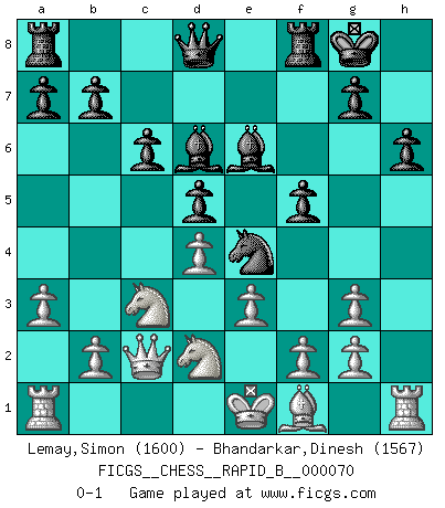 Last move : 0-1 2007 November 9 2:54:26 [Event "FICGS__CHESS__RAPID_B__000070"] [Site "FICGS"] [Date "2007.10.07"] [Round "1"] [White "Lemay,Simon"] [Black "Bhandarkar,Dinesh"] [Result "0-1"] [WhiteElo "1600"] [BlackElo "1567"] 1.Nf3 Nf6 2.d4 d5 3.c4 e6 4.Nc3 Be7 5.a3 O-O 6.cxd5 exd5 7.Bf4 c6 8.Qc2 Nbd7 9.e3 Nh5 10.Bg3 Nxg3 11.hxg3 Nf6 12.Ng5 h6 13.Nf3 Bd6 14.Ne2 Ne4 15.Nc3 f5 16.Nd2 Be6 0-1 Reti Opening Kingside Castling by player Black (move 5) Player Black won this chess game. Follow this game move after move (download)It's always better to sacrifice your opponent's men. (Savielly Tartakover) Der Vorposten provoziert a) eine Basis für neue Angriffe und b) eine Schwächung der gegnerischen Widerstandskraft in der fraglichen Linie. (Aaron Nimzowitsch) Con el fin de mejorar tu juego, debes de estudiar los finales antes que todo, ya que mientras que los finales pueden ser estudiados y dominados por sí mismos, el juegomedio y la apertura deben de ser estudiados en relación con los finales. (José Raúl Capablanca) Mais l'homme est une créature légère et illogique : semblable au joueur d'échecs, il n'aime que le processus du but à atteindre, non le but lui-même. (Dostoïevsky) Luck is the residue of design. (John Milton)
