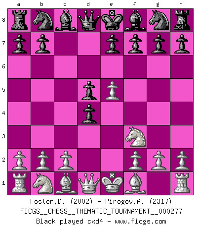 Last move : 0-1 2025 December 5 16:27:22 [Event "FICGS__CHESS__THEMATIC_TOURNAMENT__000277"] [Site "FICGS"] [Date "2025.10.21"] [Round "1"] [White "Foster,Duncan"] [Black "Pirogov,Andrey Mikhaylovich"] [Result "0-1"] [WhiteElo "2002"] [BlackElo "2317"] 1.e4 c6 2.d4 d5 3.e5 c5 4.Nf3 cxd4 5.Qxd4 e6 6.Bd3 Nc6 7.Qa4 Bd7 8.O-O Nxe5 0-1 This chess game has been lost on time (started : 2025.10.21 20:55:44) Follow this game move after move (download)I love all positions. Give me a difficult positional game, I will play it. But totally won positions, I cannot stand them. (Hein Donner) Es macht mich traurig, wenn ich sehe, dass Golfprofis mehr verdienen als Schachsportler. Obwohl ich davon überzeugt bin, dass wir Schachspieler viel härter trainieren müssen als die Golfer. (Alexandra Kosteniuk) Ser exitoso en el Ajedrez te permite descubrir tu propia personalidad. Eso es lo que deseo para los niños de mi clase. (Saudin Robovic) Ce qui est bien, c'est d'avoir tout un tas de pièces en prise : l'adversaire ne peut en prendre qu'une à la fois. Cité par Thierry Audin. Methinks King Thibault should dub Marius Zubac a knight of the square board... I mean table, henceforth addressing him as Sir Marius, and bestow on him a suitable land from the kingdom of FICGS & marry him off to a worthy, fair maiden, lest he slice our heads with his mighty sword in his wrath. (Dinesh De Silva)