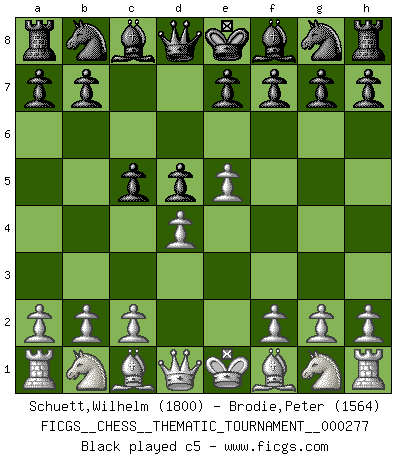 Last move : Bd6 2026 March 1 0:47:12 White clock - 70 days 16:15:25 Black clock - 30 days 15:21:27 [Event "FICGS__CHESS__THEMATIC_TOURNAMENT__000277"] [Site "FICGS"] [Date "2025.10.21"] [Round "1"] [White "Schuett,Wilhelm"] [Black "Brodie,Peter"] [Result "*"] [WhiteElo "1800"] [BlackElo "1564"] 1.e4 c6 2.d4 d5 3.e5 c5 4.dxc5 e6 5.Be3 Nc6 6.Bb5 Bd7 7.Bxc6 Bxc6 8.Bd4 Ne7 9.c3 Nf5 10.Ne2 Be7 11.O-O O-O 12.Nd2 f6 13.b4 Rc8 14.Nf3 fxe5 15.Bxe5 Kh8 16.Ned4 Nxd4 17.Qxd4 Bf6 18.Rfe1 Qd7 19.Re3 Qf7 20.Rae1 Qe7 21.Qg4 Be8 22.Bd6 * Follow this game move after move (download)Examine moves that smite! A good eye for smites is far more important than a knowledge of strategical principles. (Purdy) Karpov ist ein Museumsstück. (Garry Kasparov) Las piezas de Ajedrez son los bloques del alfabeto que moldean los pensamientos; y esos pensamientos, aunque hagan un diseño visual en el tablero, expresan abstractamente su belleza como un poema. (Marcel Duchamp) J'ai toujours senti une vague pitié pour l'homme qui ne connaît rien aux échecs, tout comme j'en aurais pour un homme ignorant de l'amour. Les Echecs, comme la musique ou comme l'amour, ont le pouvoir de rendre heureux. (Siegbert Tarrasch) I don't believe in psychology. I believe in good moves. (Bobby Fischer)