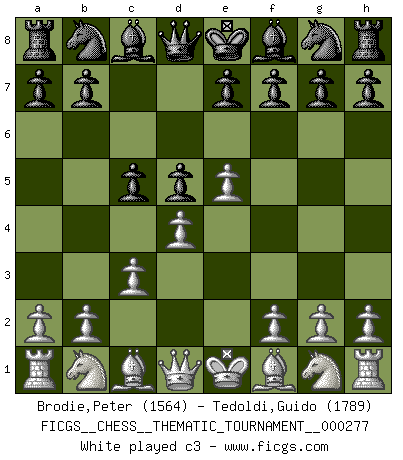 Last move : fxe3 2026 January 21 15:10:16 White clock - 23 days 04:16:59 Black clock - 43 days 04:50:21 [Event "FICGS__CHESS__THEMATIC_TOURNAMENT__000277"] [Site "FICGS"] [Date "2025.10.21"] [Round "1"] [White "Brodie,Peter"] [Black "Tedoldi,Guido"] [Result "*"] [WhiteElo "1564"] [BlackElo "1789"] 1.e4 c6 2.d4 d5 3.e5 c5 4.c3 e6 5.Nf3 Nc6 6.Be3 cxd4 7.cxd4 h6 8.Bb5 Bd7 9.Nc3 Nge7 10.Ba4 Rc8 11.O-O Nf5 12.Bxc6 Bxc6 13.a3 Be7 14.b4 Nxe3 15.fxe3 * Follow this game move after move (download)Is Bobby Fischer quite sane ? (Salo Flohr) Stil? Ich habe keinen Stil! (Anatoly Karpov) El Ajedrez es un invernadero donde los frutos del carácter pueden madurar mas completamente que en la vida. (Edward Morgan Foster) Un millionnaire : 'Monsieur Steinitz ! Vous ne participez aux tournois que pour l'argent, alors que moi je n'y viens que pour l'honneur.' Steinitz : 'Chacun joue pour ce qu'il n'a pas'... I've never seen so many men wasted so badly. (Blondie in The Good, The Bad and The Ugly)