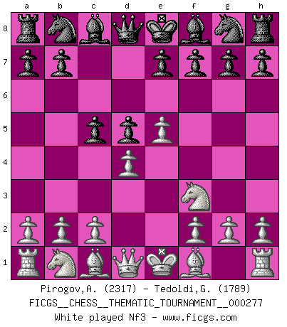 Last move : g4 2026 January 21 15:17:33 White clock - 99 days 15:32:23 Black clock - 21 days 08:41:24 [Event "FICGS__CHESS__THEMATIC_TOURNAMENT__000277"] [Site "FICGS"] [Date "2025.10.21"] [Round "1"] [White "Pirogov,Andrey Mikhaylovich"] [Black "Tedoldi,Guido"] [Result "*"] [WhiteElo "2317"] [BlackElo "1789"] 1.e4 c6 2.d4 d5 3.e5 c5 4.Nf3 e6 5.c3 Nc6 6.dxc5 Bxc5 7.b4 Bb6 8.b5 Nce7 9.Bd3 Bd7 10.O-O h6 11.a4 Rc8 12.Nbd2 Rxc3 13.Nb3 g6 14.Bb2 Rc7 15.a5 Bc5 16.Nxc5 Rxc5 17.Qb3 Nf5 18.Ba3 Rc8 19.Qb4 Nge7 20.g4 * Follow this game move after move (download)I have added these principles to the law: get the Knights into action before both Bishops are developed. (Emanuel Lasker) Als ich elf wurde, wurde ich einfach gut. (Robert James Fischer) Fischer es una tragedia del Ajedrez Americano a la par con Morphy y Pillsbury. (Mig Greengard) Même si vous avez un bon coup à faire, regardez toujours s'il n'y en a pas un qui lui soit préférable. (Pedro Damiano) Drag your thoughts away from your troubles... by the ears, by the heels, or any other way you can manage it. (Mark Twain)
