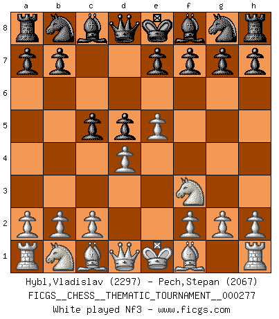 Last move : Qxf3 2026 January 17 12:34:8 White clock - 38 days 21:07:39 Black clock - 34 days 23:33:09 [Event "FICGS__CHESS__THEMATIC_TOURNAMENT__000277"] [Site "FICGS"] [Date "2025.10.21"] [Round "1"] [White "Hybl,Vladislav"] [Black "Pech,Stepan"] [Result "*"] [WhiteElo "2297"] [BlackElo "2067"] 1.e4 c6 2.d4 d5 3.e5 c5 4.Nf3 Nc6 5.dxc5 Bg4 6.c3 e6 7.Be3 a6 8.Nbd2 Nxe5 9.h3 Bxf3 10.Nxf3 Nxf3+ 11.Qxf3 * Follow this game move after move (download)A good sacrifice is one that is not necessarily sound but leaves your opponent dazed and confused. (Rudolph Spielmann) Jeder Fehler erscheint unglaublich dumm, wenn andre ihn begehen. (Georg Christoph Lichtenberg) Un mal día en el Ajedrez, es mejor que cualquier buen día en el trabajo. (Anonymous) Pour se monter efficace, un Cavalier a besoin d'avant-postes ! Les Cavaliers font les meilleurs bloqueurs de pions passés. Waiting for chance ? Play in casinos. (FICGS proverb)