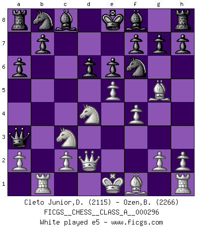 Last move : 0-1 2025 November 13 10:26:32 [Event "FICGS__CHESS__CLASS_A__000296"] [Site "FICGS"] [Date "2025.10.27"] [Round "1"] [White "Cleto Junior,Dirceu"] [Black "Ozen,Bahadir"] [Result "0-1"] [WhiteElo "2115"] [BlackElo "2266"] 1.e4 c5 2.Nf3 d6 3.d4 cxd4 4.Nxd4 Nf6 5.Nc3 a6 6.Bg5 e6 7.f4 Qb6 8.Qd2 Qxb2 9.Rb1 Qa3 10.e5 h6 11.Bh4 dxe5 12.fxe5 g5 13.Bf2 Ng4 14.Bg3 Bg7 15.Bb5+ Bd7 16.Bxd7+ Nxd7 17.Rb3 Qa5 18.Rxb7 Ngxe5 19.Nc6 Nf3+ 0-1 Follow this game move after move (download)Chess is a fighting game which is purely intellectual and includes chance. (Richard Reti) Wer sich die Fähigkeit anerziehen will im Schach selbstständig zu denken, der muß alles meiden, was leblos ist: ausgeklügelte Theorien, die sich auf sehr wenige Beispiele und eine Menge Hirngespinste stützen. (Emanuel Lasker) Cuando no sepas que mover, espera por una idea que se le venga a la la cabeza de tu oponente. Tenlo por seguro de que esa idea estará incorrecta. (Siegbert Tarrasch) La solitude du joueur d'Echecs à l'approche du mat est semblable à celle du condamné. (Francis Szpiner) When you've done things right people won't know you've done anything at all. (Futurama)