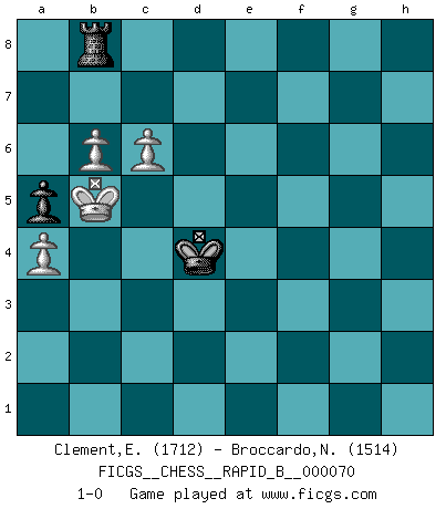 Last move : 1-0 2008 January 29 13:46:34 [Event "FICGS__CHESS__RAPID_B__000070"] [Site "FICGS"] [Date "2007.10.07"] [Round "1"] [White "Clement,Etienne"] [Black "Broccardo,Nicola"] [Result "1-0"] [WhiteElo "1712"] [BlackElo "1514"] 1.e4 d6 2.d4 Nf6 3.Nc3 g6 4.f4 Bg7 5.Nf3 O-O 6.Be3 Bg4 7.Qd2 e6 8.Ng5 Nh5 9.h3 Ng3 10.hxg4 Nxh1 11.O-O-O Ng3 12.Bc4 Nxe4 13.Ngxe4 d5 14.Bb3 dxe4 15.Nxe4 Qd7 16.Nc5 Qc8 17.d5 exd5 18.Qxd5 c6 19.Qg5 Qe8 20.f5 h6 21.Qf4 g5 22.Qf3 Qe7 23.Bf2 b6 24.Nd3 Rc8 25.Re1 Qd8 26.Qe4 Nd7 27.Qe7 Qxe7 28.Rxe7 Nf6 29.Rxf7 Kh7 30.Bd4 Rf8 31.Re7 Rad8 32.Bc3 a5 33.Be6 c5 34.Bxf6 Rxf6 35.Ne5 Rd6 36.Nd7 Rfxe6 37.Nf8+ Kg8 38.Nxe6 Bf6 39.Rb7 Be5 40.a4 Bf4+ 41.Kb1 Be5 42.c3 c4 43.Rb8+ Kf7 44.Kc1 Bf4+ 45.Nxf4 gxf4 46.Rc8 Kf6 47.Rxc4 Kg5 48.Re4 Kxg4 49.Re6 Rd7 50.Rxb6 Kxf5 51.Rxh6 Rg7 52.Rh2 Kg4 53.Rh8 Kg3 54.Rf8 Rg4 55.Kd2 Kxg2 56.Ke2 Kg3 57.b4 Rg6 58.b5 Re6+ 59.Kd3 f3 60.c4 f2 61.c5 Re8 62.Rxf2 Kxf2 63.b6 Rb8 64.Kc4 Ke3 65.Kb5 Kd4 66.c6 1-0 Pirc : Austrian attack, 6.Be3 Kingside Castling by player Black (move 5) Queenside Castling by player White (move 11) 10 pieces endgame at move 51 : White KRPPPP , Black KRPP WHITE : King + 1 Rook 4 Pawns BLACK : King + 1 Rook 2 Pawns 9 pieces endgame at move 55 : White KRPPP , Black KRPP WHITE : King + 1 Rook 3 Pawns BLACK : King + 1 Rook 2 Pawns 8 pieces endgame at move 62 : White KRPPP , Black KRP WHITE : King + 1 Rook 3 Pawns BLACK : King + 1 Rook 1 Pawn 7 pieces endgame at move 62 : White KPPP , Black KRP WHITE : King + 3 Pawns BLACK : King + 1 Rook 1 Pawn Player White won this chess game. Follow this game move after move (download)Chess is a matter of delicate judgment, knowing when to punch and how to duck. (Bobby Fischer) Nie in meinem Leben habe ich die französische Verteidigung gespielt, welche die Stumpfsinnigste von allen ist. (Wilhelm Steinitz) Evita las multitudes. Haz independientemente tu propio razonamiento. Trata de ser el jugador de Ajedrez, no la pieza de Ajedrez. (Ralph Charell) Je menace de comprendre la position. (Anonyme) Over-the-board chess is the favorite of mortals, correspondence chess is the favorite of the gods. (Eduard Dyckhoff)