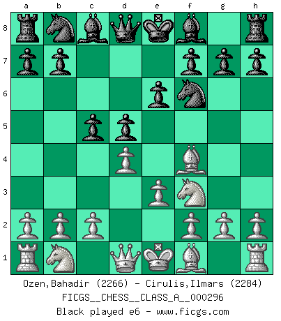 Last move : 1/2-1/2 2025 November 9 13:54:58 [Event "FICGS__CHESS__CLASS_A__000296"] [Site "FICGS"] [Date "2025.10.27"] [Round "1"] [White "Ozen,Bahadir"] [Black "Cirulis,Ilmars"] [Result "1/2-1/2"] [WhiteElo "2266"] [BlackElo "2284"] 1.Nf3 d5 2.d4 Nf6 3.Bf4 c5 4.e3 e6 5.Nbd2 Nc6 6.c3 Be7 7.Ne5 Qb6 8.Rb1 Nxe5 9.Bxe5 Bd7 10.a4 O-O 11.Bd3 Qd8 12.O-O a5 13.h3 Bc6 14.b3 Bd6 15.Qc2 h6 16.Nf3 b6 17.Qb2 Rc8 18.Rbc1 c4 19.Bxd6 Qxd6 20.Be2 cxb3 21.Qxb3 1/2-1/2 Follow this game move after move (download)The mistakes are there, waiting to be made. (Savielly Tartakower) Nicht daß Diemer aus Opportunismus Mitglied der NSDAP geworden wäre. Er war ein Fanatiker, in allem, was er tat. (Hans Ree) La mitad de las variaciones que son calculadas en una partida de torneo, resultan ser completamente superfluas. Desafortunadamente, nadie sabe por adelantado cual mitad. (Jan Tinman) J'ai toujours senti une vague pitié pour l'homme qui ne connaît rien aux échecs, tout comme j'en aurais pour un homme ignorant de l'amour. Les Echecs, comme la musique ou comme l'amour, ont le pouvoir de rendre heureux. (Siegbert Tarrasch) Life is like a play: it's not the length but the excellence of the acting that matters. (Seneca)