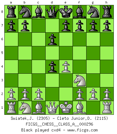 Last move : 1/2-1/2 2025 December 20 14:17:59 [Event "FICGS__CHESS__CLASS_A__000296"] [Site "FICGS"] [Date "2025.10.27"] [Round "1"] [White "Swiatek,Janusz"] [Black "Cleto Junior,Dirceu"] [Result "1/2-1/2"] [WhiteElo "2305"] [BlackElo "2115"] 1.e4 c5 2.Nf3 d6 3.d4 cxd4 4.Nxd4 Nf6 5.Nc3 a6 6.Bg5 e6 7.f4 Qb6 8.Qd2 Qxb2 9.Rb1 Qa3 10.f5 Nc6 11.fxe6 fxe6 12.Nxc6 bxc6 13.Be2 Be7 14.e5 dxe5 15.Bxf6 Bxf6 16.Bh5+ g6 17.Ne4 O-O 18.O-O Bg7 19.Rxf8+ Qxf8 20.Be2 a5 21.Bc4 Qe7 22.Qf2 h6 23.h4 Kh7 24.Rb6 Bb7 25.Nc5 Bc8 26.Bd3 e4 27.Bxe4 Be5 1/2-1/2 Follow this game move after move (download)Via the squares on the chessboard, the Indians explain the movement of time and the age, the higher influences which control the world and the ties which link Chess with the human soul. (Al-Masudi) Die Partien sind immer verschieden, die Interviews immer die gleichen. (Garry Kasparov) El Ajedrez no es una pizca de inferior al violín, y tenemos un gran número de violinistas profesionales. (Mikhail Botvinnik) Les Echecs, c'est l'art de la guerre sans les charniers, c'est la résurrection des morts tombés au champ d'honneur, l'espoir perpétuel, la suprématie de l'intelligence sur la force, la culture de l'esprit. (F. Szpiner) There's no money in correspondence chess. (John Knudsen)