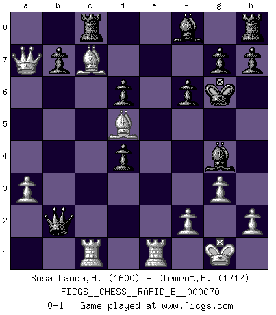 Last move : 0-1 2008 January 16 23:22:12 [Event "FICGS__CHESS__RAPID_B__000070"] [Site "FICGS"] [Date "2007.10.07"] [Round "1"] [White "Sosa Landa,Hugo Rafael"] [Black "Clement,Etienne"] [Result "0-1"] [WhiteElo "1600"] [BlackElo "1712"] 1.g3 d5 2.Nf3 Bg4 3.Bg2 Nc6 4.d4 Nf6 5.O-O Qd7 6.Ne5 Qe6 7.c4 Nxe5 8.dxe5 Qxe5 9.Nc3 d4 10.Bf4 Qc5 11.Nd5 Nxd5 12.cxd5 Qb4 13.Rc1 Rc8 14.Bxc7 f6 15.a3 Qxb2 16.Qa4+ Kf7 17.Qxa7 Bxe2 18.Rfe1 Bg4 19.d6 exd6 20.Bd5+ Kg6 0-1 This chess game has been lost on time (started : 2007.10.07 16:34:7) Benko's Opening Kingside Castling by player White (move 5) Player Black won this chess game. Follow this game move after move (download)Chess is the art which expresses the science of logic. (Mikhail Botvinnik) Im Leben werden Partien nie so unstrittig gewonnen wie im Spiel (Emanuel Lasker) Por esta medida (el intervalo entre Fischer y sus contemporaneos), yo le considero el mas grande campeón mundial. (Garry Kasparov) La menace est plus forte que l'exécution. (Aaron Nimzovitch) Macintosh - we might not get everything right, but at least we knew the century was going to end. (Douglas Adams)