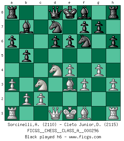 Last move : 1/2-1/2 2025 November 2 8:12:51 [Event "FICGS__CHESS__CLASS_A__000296"] [Site "FICGS"] [Date "2025.10.27"] [Round "1"] [White "Sorcinelli,Andrea"] [Black "Cleto Junior,Dirceu"] [Result "1/2-1/2"] [WhiteElo "2110"] [BlackElo "2115"] 1.e4 c5 2.Nf3 d6 3.d4 cxd4 4.Nxd4 Nf6 5.Nc3 a6 6.h3 e6 7.Be3 b5 8.a3 Bb7 9.f3 Nbd7 10.g4 h6 11.Qd2 d5 12.exd5 Nxd5 13.Nxd5 Bxd5 14.O-O-O Ne5 15.Be2 Qc7 1/2-1/2 Follow this game move after move (download)The chessboard is the world, the pieces are the phenomena of the Universe, the rules of the game are what we call the laws of Nature and the player on the other side is hidden from us. (Thomas Huxley) Es ist schade, dass viele Schachsportler vergessen, wie wichtig Auftreten und angemessene Kleidung sind. (Alexandra Kosteniuk) Tu eres para mi la Reina en d8 y yo soy el Peón en d7!!. (GM Eduard Gufeld) A ce moment-là, je menaçais de comprendre la position ! (Clément L'Heureux) Knowledge will give you power, but character respect. (Bruce Lee)