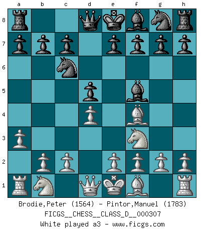 Last move : Kb8 2026 January 23 23:47:40 White clock - 48 days 21:34:01 Black clock - 96 days 20:52:04 [Event "FICGS__CHESS__CLASS_D__000307"] [Site "FICGS"] [Date "2025.10.27"] [Round "1"] [White "Brodie,Peter"] [Black "Pintor,Manuel"] [Result "*"] [WhiteElo "1564"] [BlackElo "1783"] 1.d4 d5 2.Nf3 Nc6 3.Bf4 Bf5 4.a3 f6 5.Nc3 a6 6.e3 e6 7.Bd3 Bxd3 8.Qxd3 Bd6 9.Bxd6 Qxd6 10.O-O O-O-O 11.Rae1 Nge7 12.g3 Ng6 13.e4 dxe4 14.Nxe4 Qd5 15.c4 Qf5 16.Qe3 h5 17.h4 Qg4 18.Nc5 e5 19.Qe4 Qxe4 20.Rxe4 Nxd4 21.Nxd4 exd4 22.Rd1 d3 23.Rxd3 Ne5 24.Rxd8+ Rxd8 25.f4 Ng4 26.Re7 Rg8 27.f5 Nh6 28.Ne6 Nxf5 29.Rxc7+ Kb8 30.* Follow this game move after move (download)Different people feel differently about resigning. (Bobby Fischer) Ohne ihre Erfolge schmälern zu wollen würde ich sagen Petrosian, Spassky und Karpov verdanken ihre Siege ihren Trainern - Boleslavsky, Bondarevsky und Furman. (Mikhail Moiseyevich Botvinik) El ganador de una partida es aquel jugador que hace el penúltimo error. (Savielly Tartakover) La solitude du joueur d'Echecs à l'approche du mat est semblable à celle du condamné. (Francis Szpiner) Either move or be moved. (Ezra Pound)